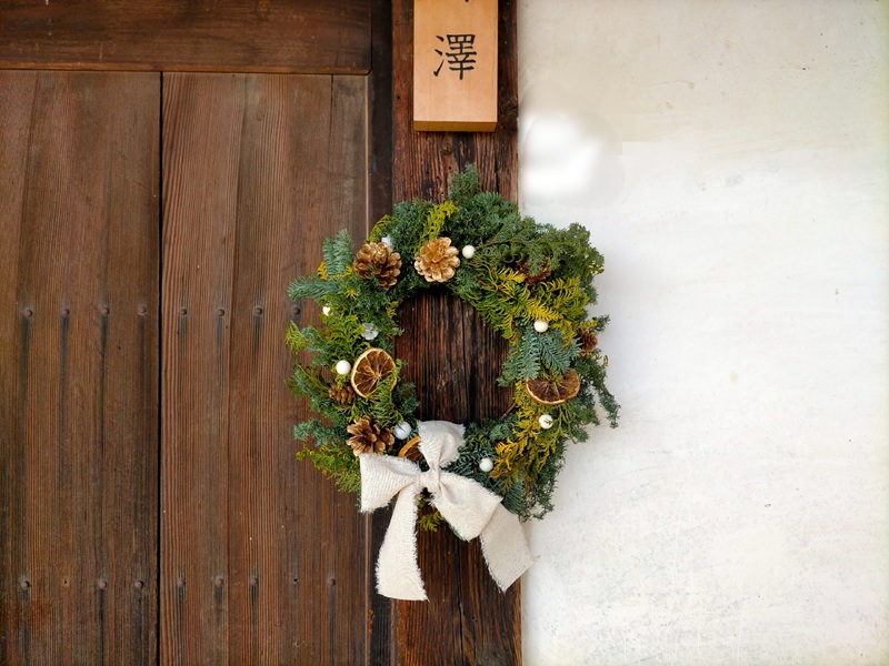 地区のイベントでクリスマスリースを作ったので早速玄関に飾ってみました。和風にも洋風にも合う落ち着いたデザインです。
