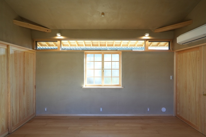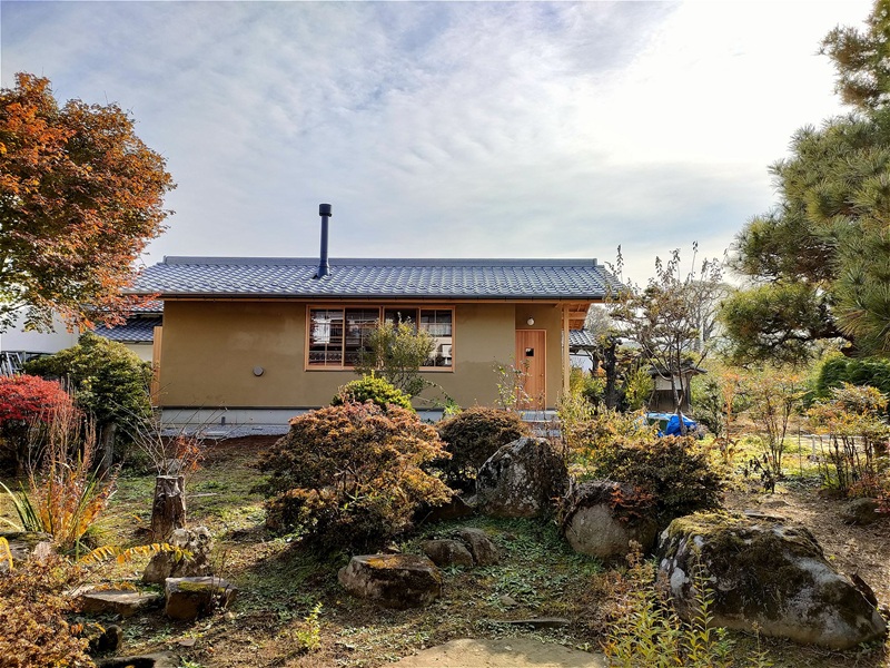 母屋の向かいに建つ小さなアトリエです。母屋との間には手入れの行き届いた綺麗な庭があり、その庭を眺めながら創作活動をすることができます。小さなアトリエですが、お施主さんの自然素材へのこだわりと、施工会社さんの天然乾燥材を用いた手刻みへのこだわりが上手く融合した建物となりました。左官仕上げにはもともと建っていた小屋に使われていた土壁を再利用しており、とても落ち着いた雰囲気で味のある仕上がりとなっています。窓もアルミや樹脂サッシは使用せず、全て職人さんが作る昔ながらの木製建具となっています。古い集落の中に建つ新築の建物ですが、周りの景観と違和感なく馴染むことができたと思います。